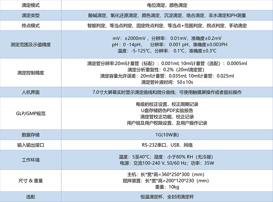 CT-1PLUS多功能全自動(dòng)滴定儀是具備顏色滴定和自動(dòng)電位滴定功能于一體的新一代滴定儀,儀器采用模塊化設(shè)計(jì),由高精度計(jì)量管滴定裝置、控制裝置和檢測(cè)裝置三部分組成,除了進(jìn)行常規(guī)的電位滴定如PH酸堿滴定、氧化還原滴定、沉淀滴定和絡(luò)合滴定外,還可以進(jìn)行通過(guò)顏色判斷終點(diǎn)的傳統(tǒng)滴定。儀器可以自動(dòng)判斷終點(diǎn),可實(shí)現(xiàn)固定終點(diǎn)滴定、動(dòng)態(tài)滴定、組合交叉滴定和手動(dòng)滴定功能。支持自動(dòng)停止檢測(cè)和手動(dòng)停止檢測(cè),關(guān)鍵滴定組件具備緊急停止保護(hù)功能。